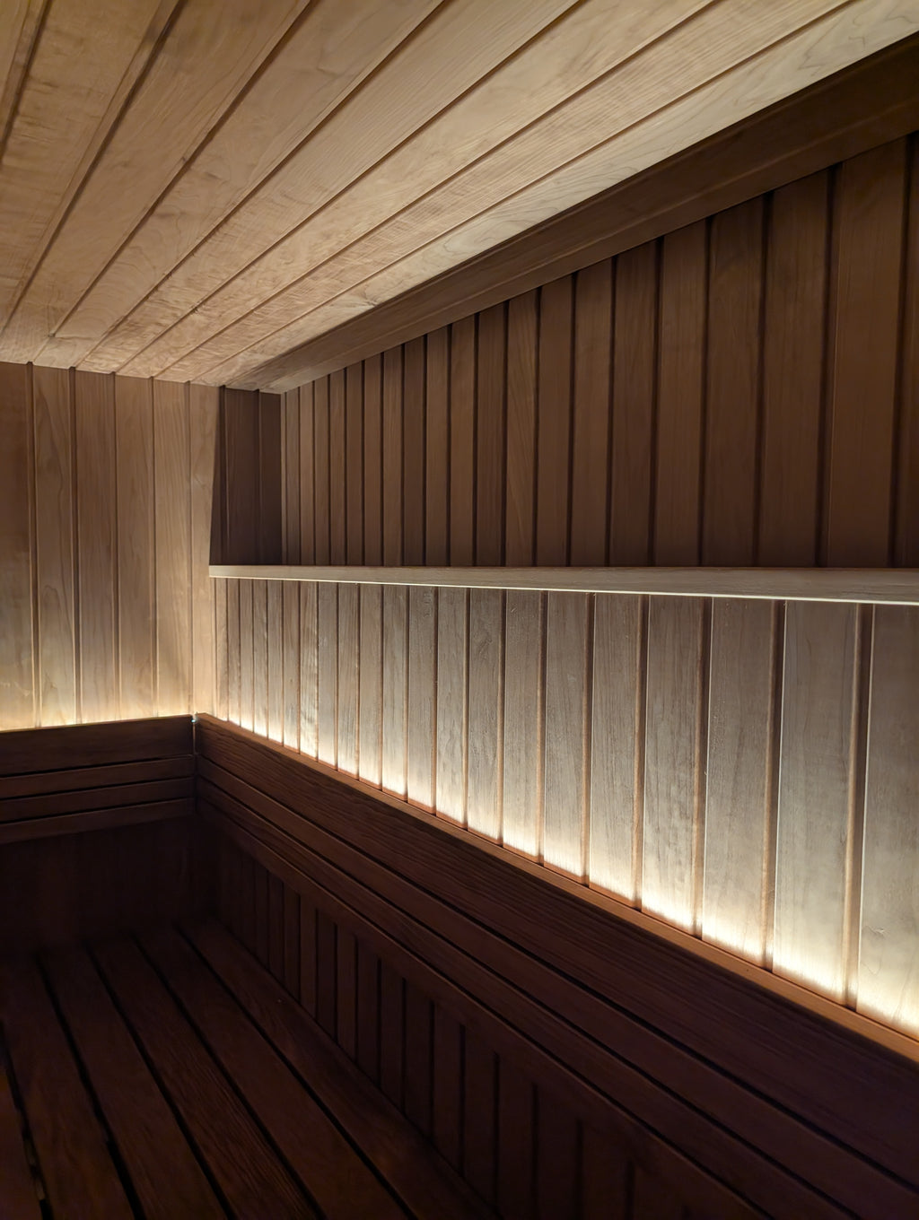 De sauna in uitgevoerd in Thermo Aspen met geoliede banken, rugleuning en tussenbank afdichting.