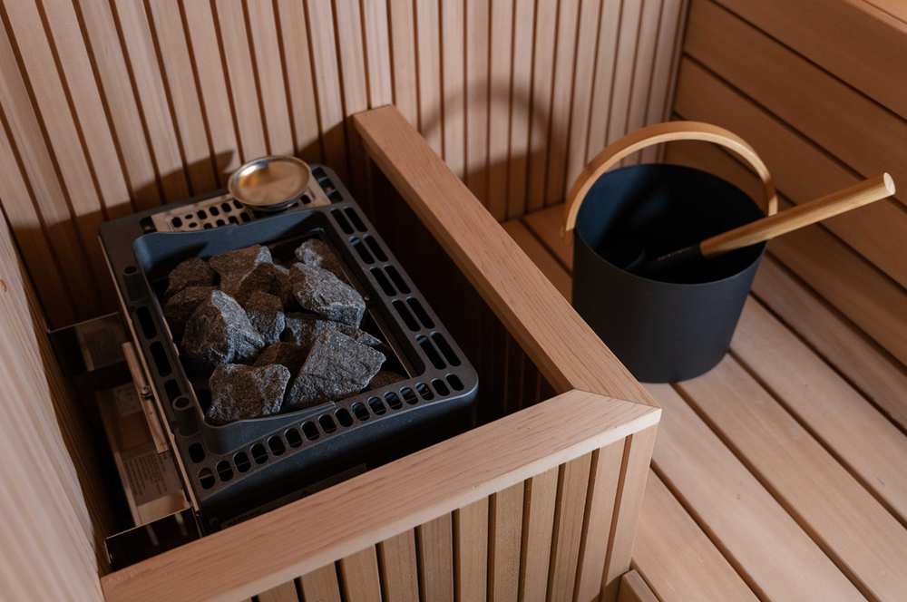 Saunaofen mit Verdampfer für flexible Klimaeinstellungen: traditionelle trockene finnische Sauna, Softsauna, Kräuterbad etc.