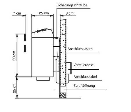 Steinlager als zusätzliche Edelstahl-Innenschale. Edelstahl-Außenschale. Oberteil aus Druckguss. Anschlusskasten auf der Rückseite. Inklusive Wandhalterungen. 12 kW-Version komplett aus Edelstahl.