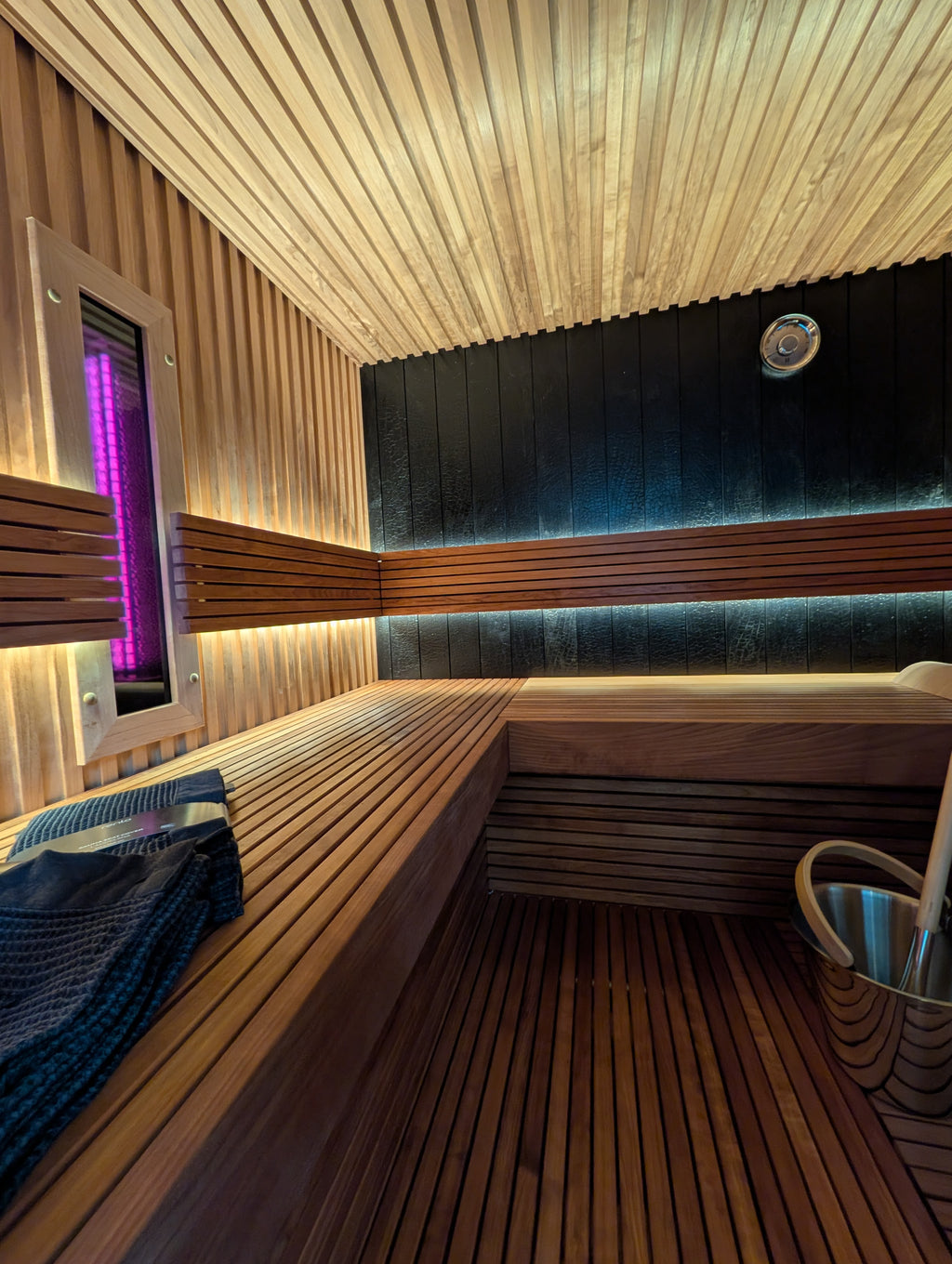De sauna is verder voorzien van 2 Vitae Infraroodlampen en een EOS Organic Saunakachel met een EOS Emotsyle Hi saunabesturing.